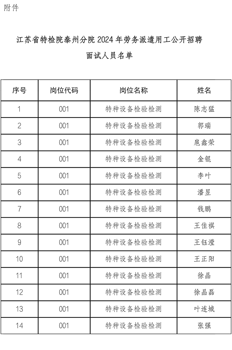 根據《江蘇省特種設備安全監督檢驗研究院泰州分院2024年勞務派遣用工招聘公告》,經資格審核,現將參加面試人員名單予以公示(名單附后)。面試時間、地點另行通知。